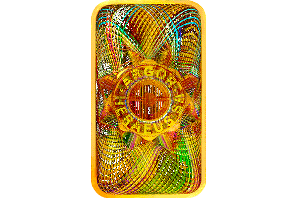 The Kinebar® is a minted gold bar with an additional security feature, the Kinegram®. This hologram technology is commonly known for its use in passports and bank notes. It is not only visually appealing but also enhances the security of this bar. The hologram covers the back side of the Kinebar®. For this purpose, fine micro-structures are applied directly to the surface during the production process, creating the shimmering effect.